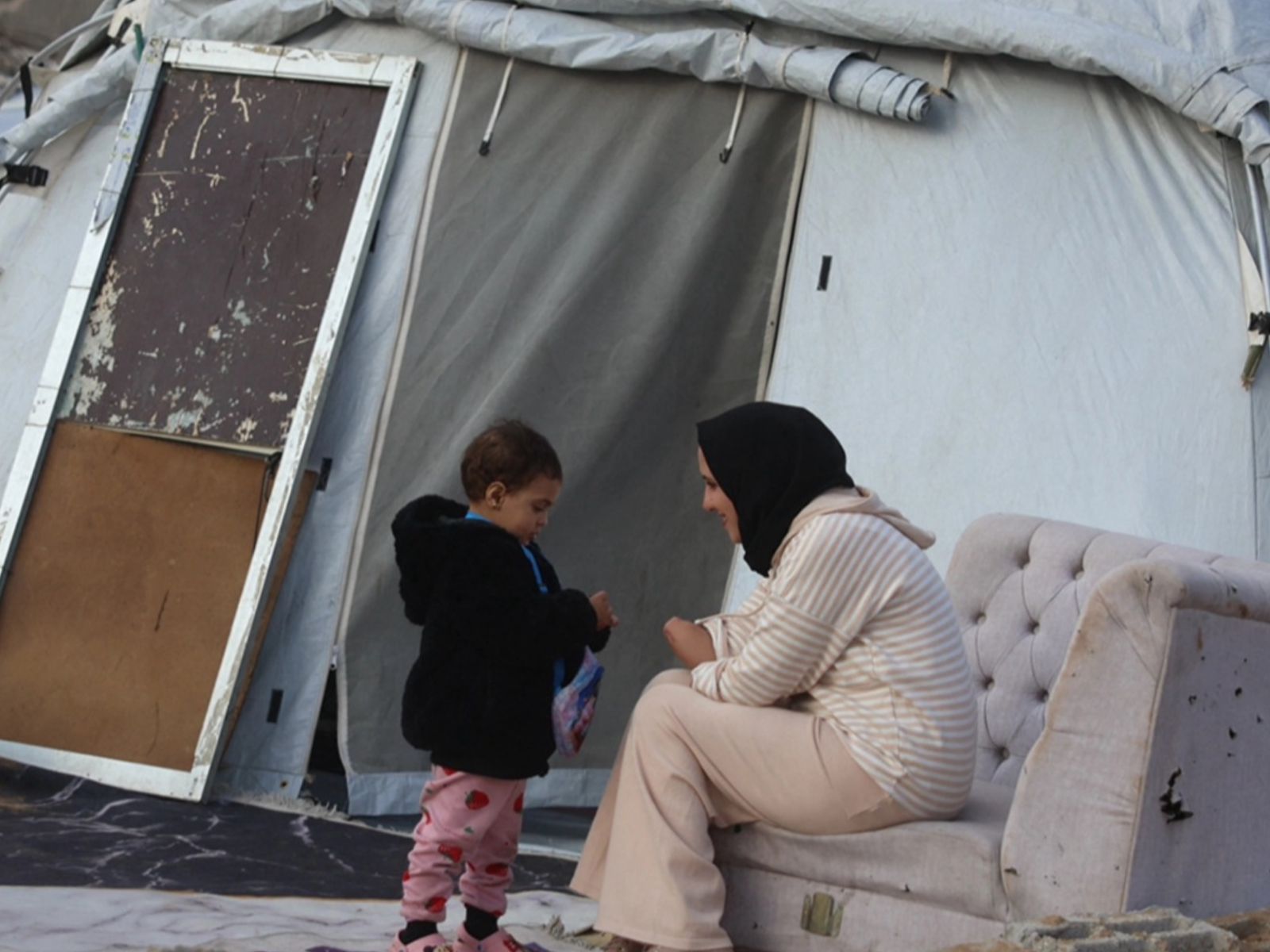 وعلى فراش أرضي، تجلس الهسي إلى جانب طفلتها محاولة تسريح شعرها القصير وإضفاء بعض البهجة على وجهها، قبل أن تبتسم الطفلة حين تنظر إلى نفسها في المرآة، وتقبل ما تبقى من ذراعي والدتها تعبيرا عن حبها.